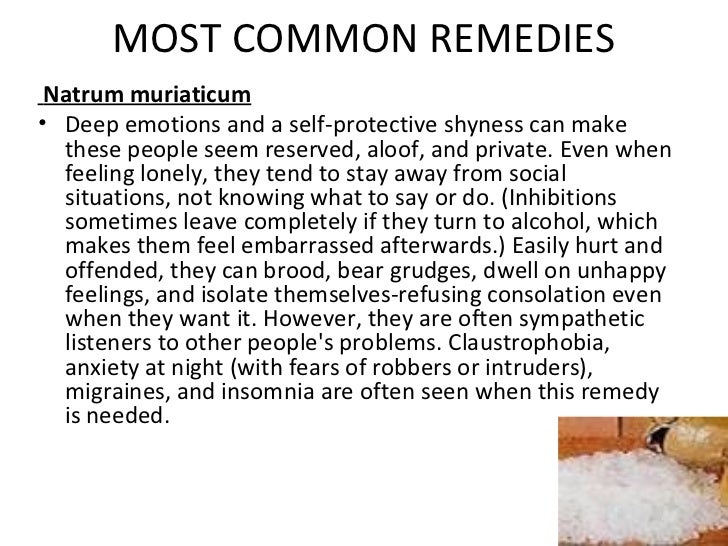 - 159. MOST COMMON REMEDIES Natrum muriaticum• Deep emotions and a self-protective shyness can make these people seem reserved, aloof, and private. Even when feeling lonely, they tend to stay away from social situations, not knowing what to say or do. (Inhibitions sometimes leave completely if they turn to alcohol, which makes them feel embarrassed afterwards.) Easily hurt and offended, they can brood, bear grudges, dwell on unhappy feelings, and isolate themselves-refusing consolation even when they want it. However, they are often sympathetic listeners to other peoples problems. Claustrophobia, anxiety at night (with fears of robbers or intruders), migraines, and insomnia are often seen when this remedy is needed.