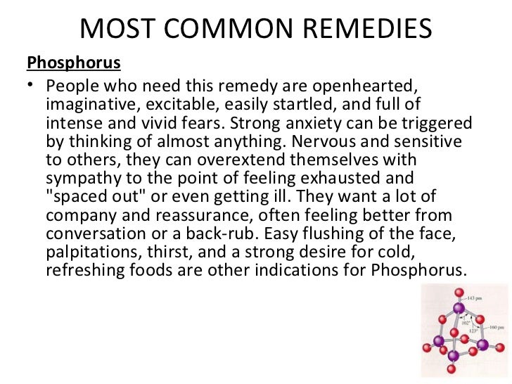 - 160. MOST COMMON REMEDIES Phosphorus• People who need this remedy are openhearted, imaginative, excitable, easily startled, and full of intense and vivid fears. Strong anxiety can be triggered by thinking of almost anything. Nervous and sensitive to others, they can overextend themselves with sympathy to the point of feeling exhausted and "spaced out" or even getting ill. They want a lot of company and reassurance, often feeling better from conversation or a back-rub. Easy flushing of the face, palpitations, thirst, and a strong desire for cold, refreshing foods are other indications for Phosphorus.