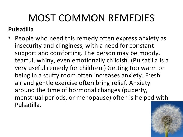 - 161. MOST COMMON REMEDIES Pulsatilla• People who need this remedy often express anxiety as insecurity and clinginess, with a need for constant support and comforting. The person may be moody, tearful, whiny, even emotionally childish. (Pulsatilla is a very useful remedy for children.) Getting too warm or being in a stuffy room often increases anxiety. Fresh air and gentle exercise often bring relief. Anxiety around the time of hormonal changes (puberty, menstrual periods, or menopause) often is helped with Pulsatilla.