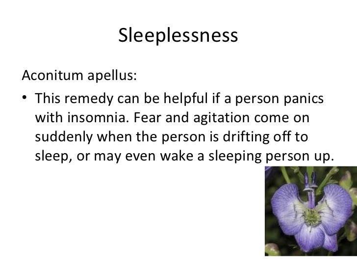 - 163. Sleeplessness Aconitum apellus:• This remedy can be helpful if a person panics with insomnia. Fear and agitation come on suddenly when the person is drifting off to sleep, or may even wake a sleeping person up.