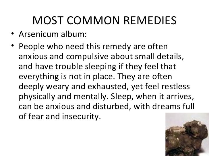 - 164. MOST COMMON REMEDIES• Arsenicum album:• People who need this remedy are often anxious and compulsive about small details, and have trouble sleeping if they feel that everything is not in place. They are often deeply weary and exhausted, yet feel restless physically and mentally. Sleep, when it arrives, can be anxious and disturbed, with dreams full of fear and insecurity.
