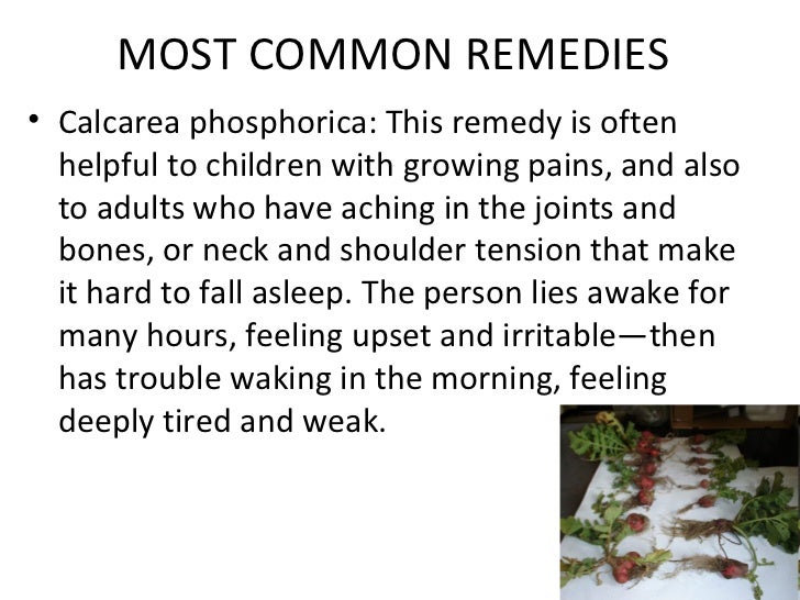 - 165. MOST COMMON REMEDIES• Calcarea phosphorica: This remedy is often helpful to children with growing pains, and also to adults who have aching in the joints and bones, or neck and shoulder tension that make it hard to fall asleep. The person lies awake for many hours, feeling upset and irritable—then has trouble waking in the morning, feeling deeply tired and weak.