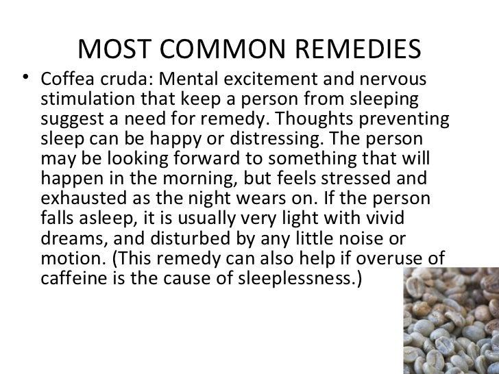 - 167. MOST COMMON REMEDIES• Coffea cruda: Mental excitement and nervous stimulation that keep a person from sleeping suggest a need for remedy. Thoughts preventing sleep can be happy or distressing. The person may be looking forward to something that will happen in the morning, but feels stressed and exhausted as the night wears on. If the person falls asleep, it is usually very light with vivid dreams, and disturbed by any little noise or motion. (This remedy can also help if overuse of caffeine is the cause of sleeplessness.)
