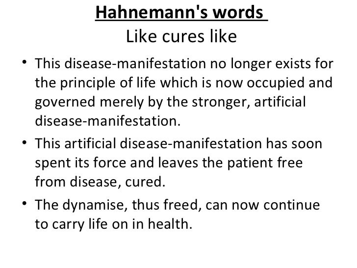 - 22. Hahnemanns words Like cures like• This disease-manifestation no longer exists for the principle of life which is now occupied and governed merely by the stronger, artificial disease-manifestation.• This artificial disease-manifestation has soon spent its force and leaves the patient free from disease, cured.• The dynamise, thus freed, can now continue to carry life on in health.