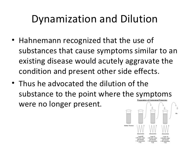 - 23. Dynamization and Dilution• Hahnemann recognized that the use of substances that cause symptoms similar to an existing disease would acutely aggravate the condition and present other side effects.• Thus he advocated the dilution of the substance to the point where the symptoms were no longer present.