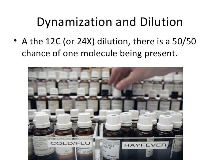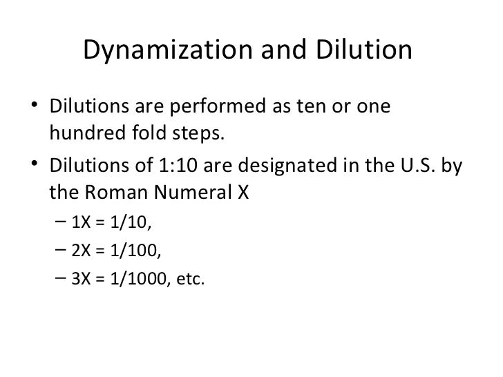 - 24. Dynamization and Dilution• Dilutions are performed as ten or one hundred fold steps.• Dilutions of 1:10 are designated in the U.S. by the Roman Numeral X – 1X = 1/10, – 2X = 1/100, – 3X = 1/1000, etc.