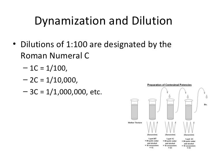 - 25. Dynamization and Dilution• Dilutions of 1:100 are designated by the Roman Numeral C – 1C = 1/100, – 2C = 1/10,000, – 3C = 1/1,000,000, etc.