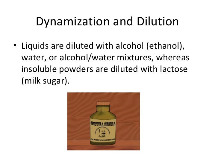 - 26. Dynamization and Dilution• Liquids are diluted with alcohol (ethanol), water, or alcohol/water mixtures, whereas insoluble powders are diluted with lactose (milk sugar).