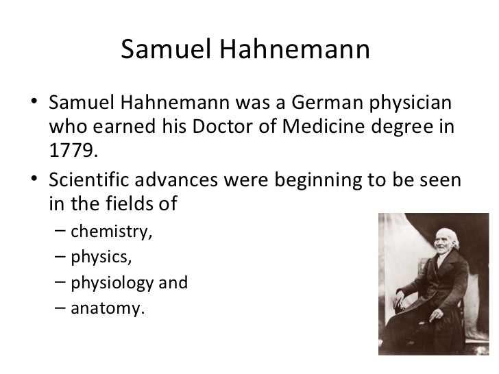 - 3. Samuel Hahnemann• Samuel Hahnemann was a German physician who earned his Doctor of Medicine degree in 1779.• Scientific advances were beginning to be seen in the fields of – chemistry, – physics, – physiology and – anatomy.