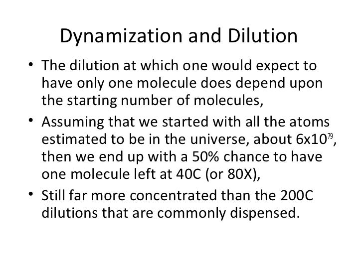 - 30. Dynamization and Dilution• The dilution at which one would expect to have only one molecule does depend upon the starting number of molecules,• Assuming that we started with all the atoms estimated to be in the universe, about 6x1079, then we end up with a 50% chance to have one molecule left at 40C (or 80X),• Still far more concentrated than the 200C dilutions that are commonly dispensed.