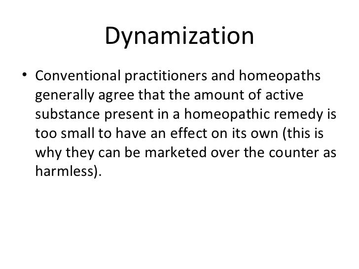 - 32. Dynamization• Conventional practitioners and homeopaths generally agree that the amount of active substance present in a homeopathic remedy is too small to have an effect on its own (this is why they can be marketed over the counter as harmless).