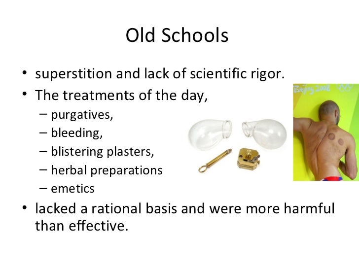 - 4. Old Schools• superstition and lack of scientific rigor.• The treatments of the day, – purgatives, – bleeding, – blistering plasters, – herbal preparations – emetics• lacked a rational basis and were more harmful than effective.