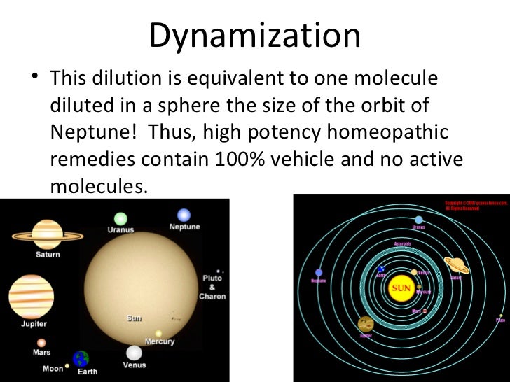 - 33. Dynamization• This dilution is equivalent to one molecule diluted in a sphere the size of the orbit of Neptune! Thus, high potency homeopathic remedies contain 100% vehicle and no active molecules.