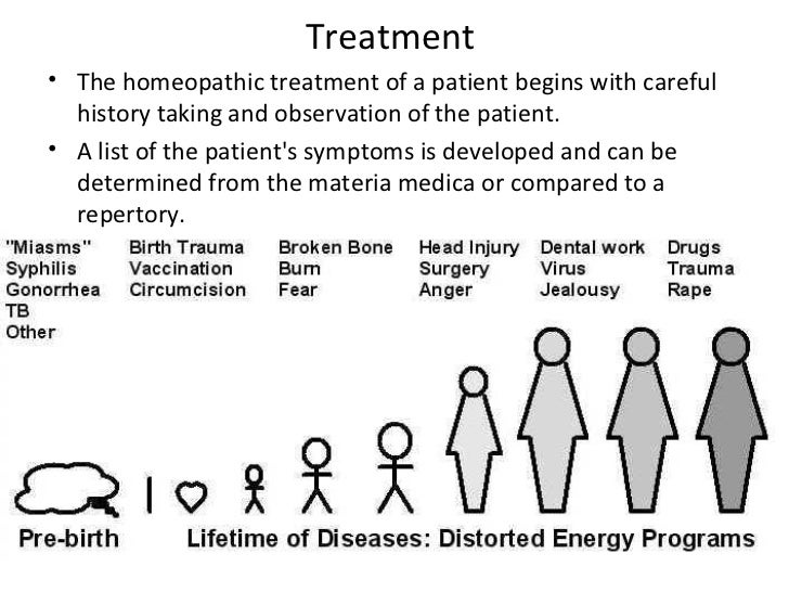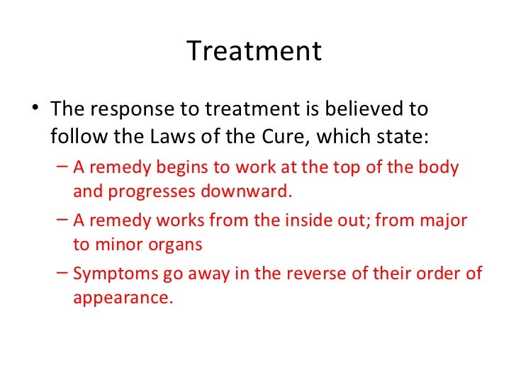 - 39. Treatment• The response to treatment is believed to follow the Laws of the Cure, which state: – A remedy begins to work at the top of the body and progresses downward. – A remedy works from the inside out; from major to minor organs – Symptoms go away in the reverse of their order of appearance.