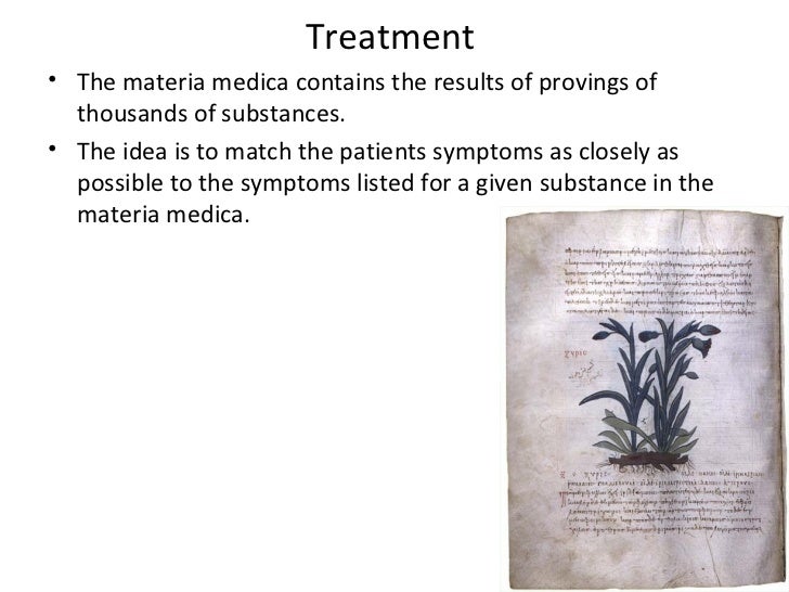 - 37. Treatment• The materia medica contains the results of provings of thousands of substances.• The idea is to match the patients symptoms as closely as possible to the symptoms listed for a given substance in the materia medica.