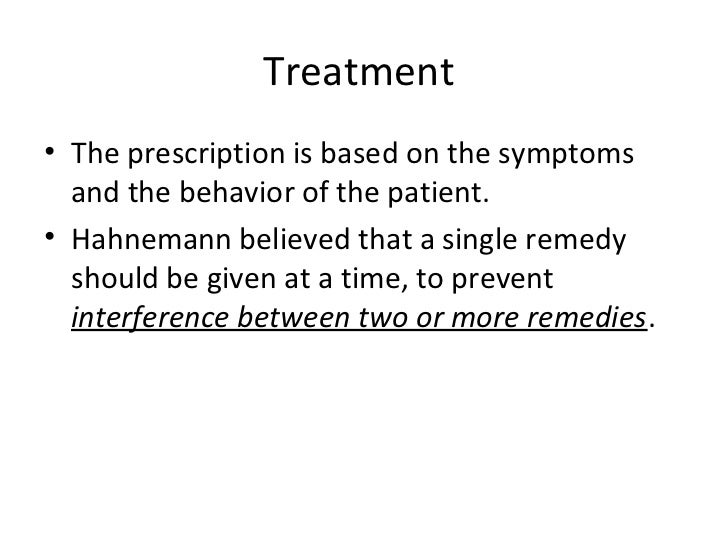 - 38. Treatment• The prescription is based on the symptoms and the behavior of the patient.• Hahnemann believed that a single remedy should be given at a time, to prevent interference between two or more remedies.