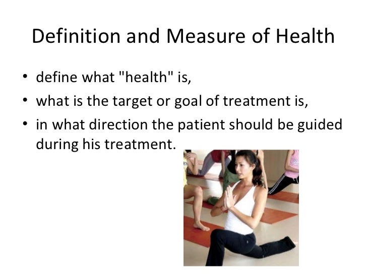 - 40. Definition and Measure of Health• define what "health" is,• what is the target or goal of treatment is,• in what direction the patient should be guided during his treatment.