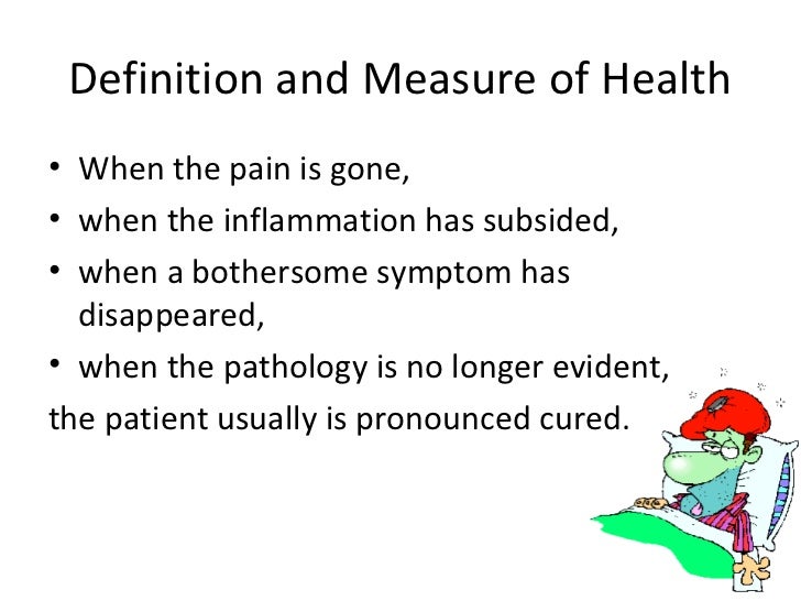 - 41. Definition and Measure of Health• When the pain is gone,• when the inflammation has subsided,• when a bothersome symptom has disappeared,• when the pathology is no longer evident,the patient usually is pronounced cured.