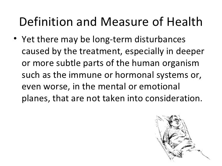 - 42. Definition and Measure of Health• Yet there may be long-term disturbances caused by the treatment, especially in deeper or more subtle parts of the human organism such as the immune or hormonal systems or, even worse, in the mental or emotional planes, that are not taken into consideration.
