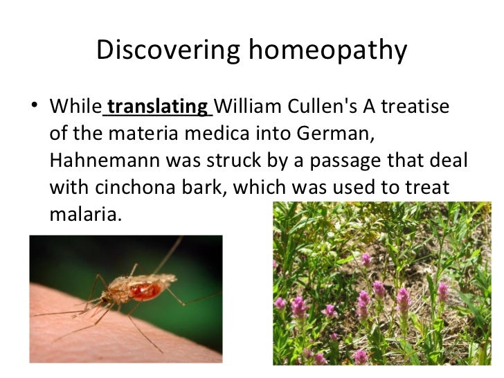 - 5. Discovering homeopathy• While translating William Cullens A treatise of the materia medica into German, Hahnemann was struck by a passage that deal with cinchona bark, which was used to treat malaria.