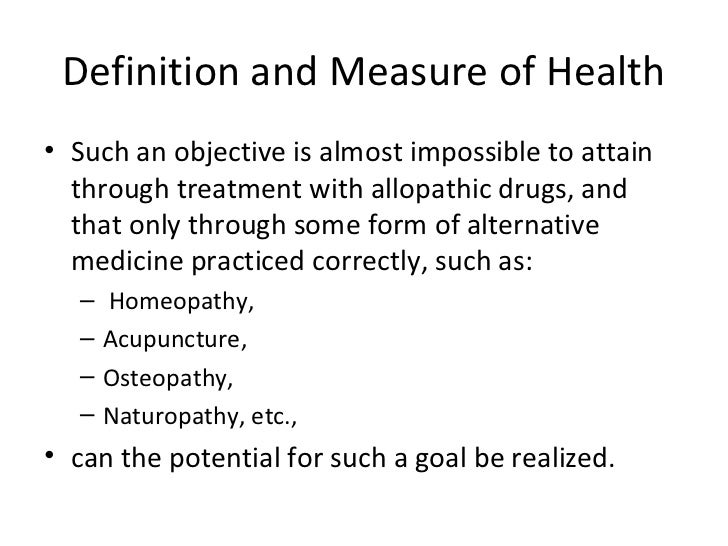 - 43. Definition and Measure of Health• Such an objective is almost impossible to attain through treatment with allopathic drugs, and that only through some form of alternative medicine practiced correctly, such as: – Homeopathy, – Acupuncture, – Osteopathy, – Naturopathy, etc.,• can the potential for such a goal be realized.
