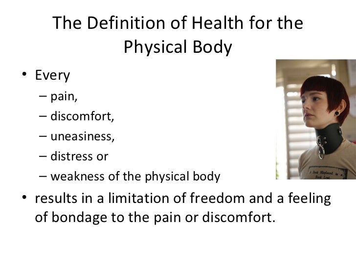 - 46. The Definition of Health for the Physical Body• Every – pain, – discomfort, – uneasiness, – distress or – weakness of the physical body• results in a limitation of freedom and a feeling of bondage to the pain or discomfort.
