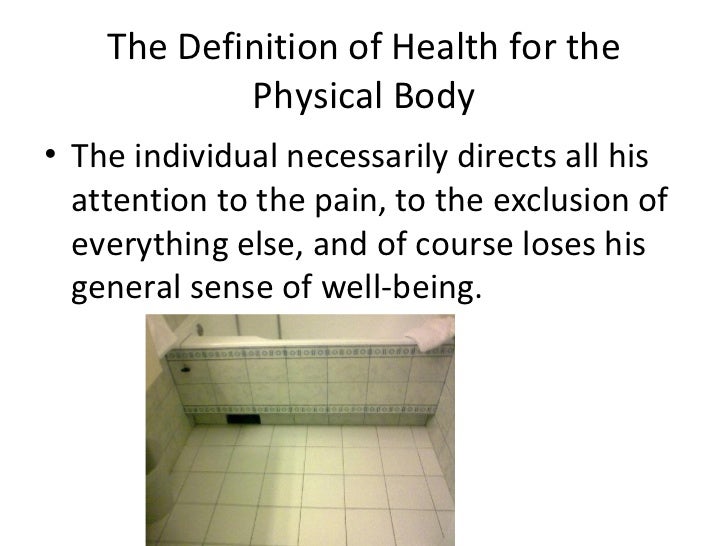 - 47. The Definition of Health for the Physical Body• The individual necessarily directs all his attention to the pain, to the exclusion of everything else, and of course loses his general sense of well-being.