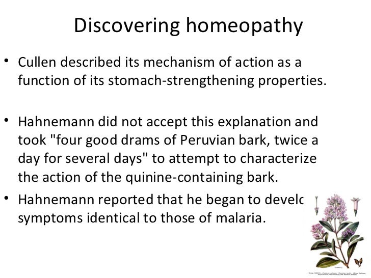 - 6. Discovering homeopathy• Cullen described its mechanism of action as a function of its stomach-strengthening properties.• Hahnemann did not accept this explanation and took "four good drams of Peruvian bark, twice a day for several days" to attempt to characterize the action of the quinine-containing bark.• Hahnemann reported that he began to develop symptoms identical to those of malaria.
