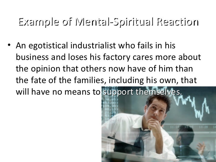 - 59. Example of Mental-Spiritual Reaction• An egotistical industrialist who fails in his business and loses his factory cares more about the opinion that others now have of him than the fate of the families, including his own, that will have no means to support themselves.