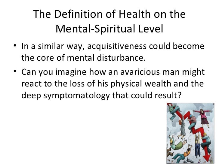 - 61. The Definition of Health on the Mental-Spiritual Level• In a similar way, acquisitiveness could become the core of mental disturbance.• Can you imagine how an avaricious man might react to the loss of his physical wealth and the deep symptomatology that could result?