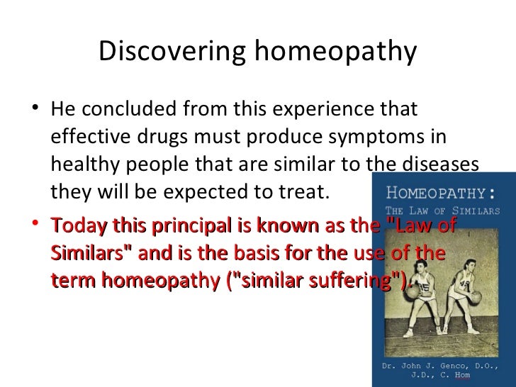 - 7. Discovering homeopathy• He concluded from this experience that effective drugs must produce symptoms in healthy people that are similar to the diseases they will be expected to treat.• Today this principal is known as the "Law of Similars" and is the basis for the use of the term homeopathy ("similar suffering").
