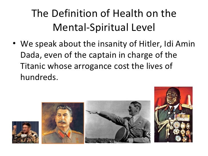 - 63. The Definition of Health on the Mental-Spiritual Level• We speak about the insanity of Hitler, Idi Amin Dada, even of the captain in charge of the Titanic whose arrogance cost the lives of hundreds.