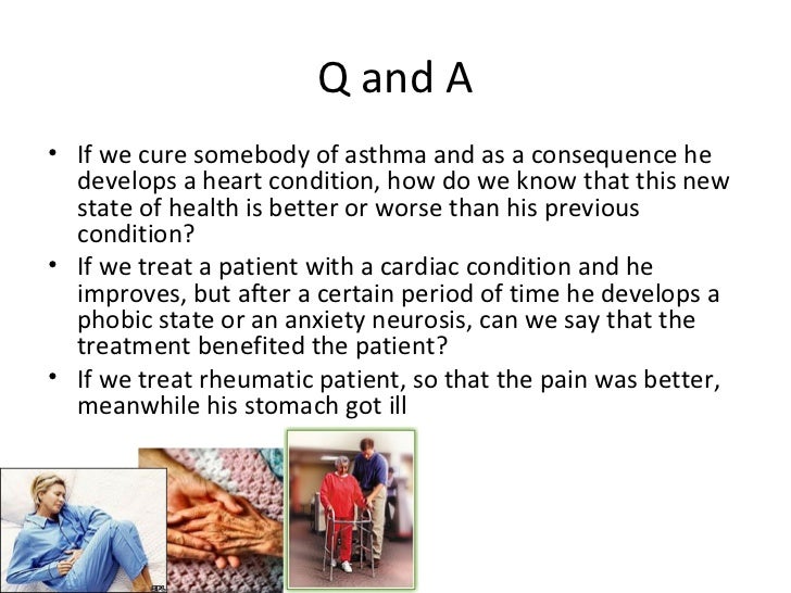 - 68. Q and A• If we cure somebody of asthma and as a consequence he develops a heart condition, how do we know that this new state of health is better or worse than his previous condition?• If we treat a patient with a cardiac condition and he improves, but after a certain period of time he develops a phobic state or an anxiety neurosis, can we say that the treatment benefited the patient?• If we treat rheumatic patient, so that the pain was better, meanwhile his stomach got ill