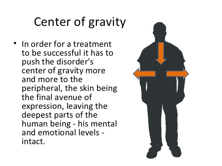 - 69. Center of gravity• In order for a treatment to be successful it has to push the disorders center of gravity more and more to the peripheral, the skin being the final avenue of expression, leaving the deepest parts of the human being - his mental and emotional levels - intact.