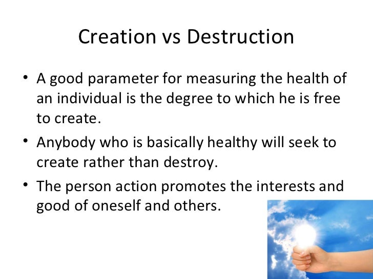 - 70. Creation vs Destruction• A good parameter for measuring the health of an individual is the degree to which he is free to create.• Anybody who is basically healthy will seek to create rather than destroy.• The person action promotes the interests and good of oneself and others.