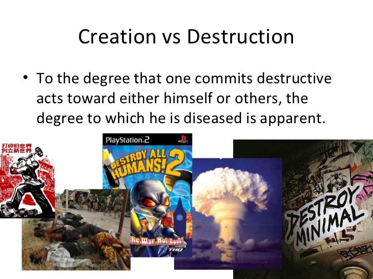- 71. Creation vs Destruction• To the degree that one commits destructive acts toward either himself or others, the degree to which he is diseased is apparent.