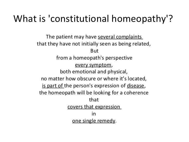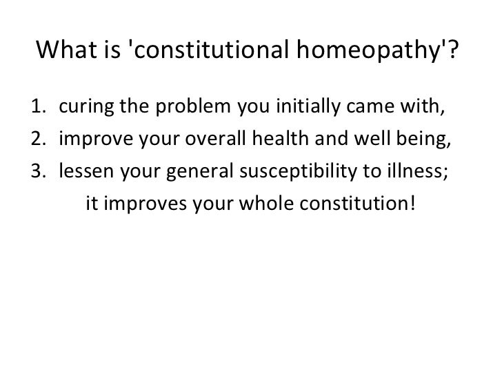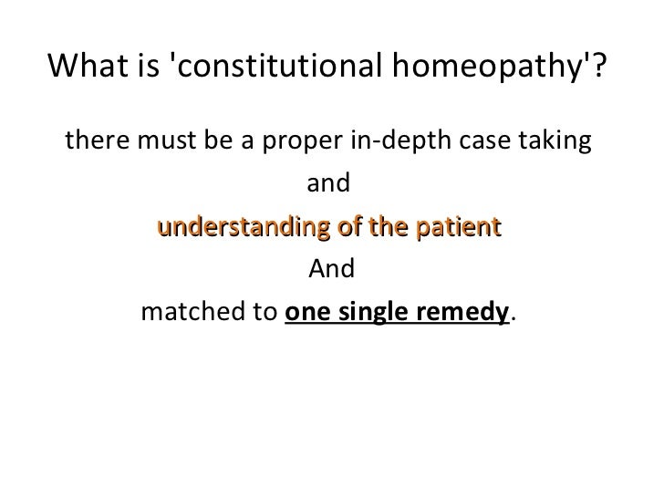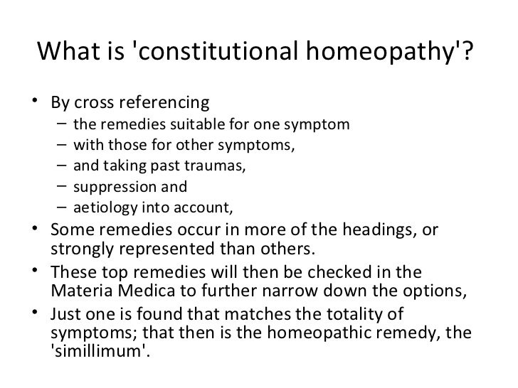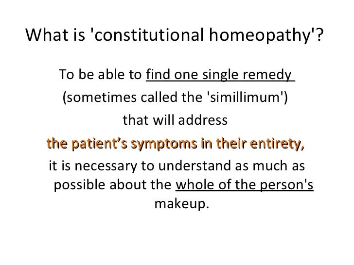 - 73. What is constitutional homeopathy? To be able to find one single remedy (sometimes called the simillimum) that will address the patient’s symptoms in their entirety, it is necessary to understand as much as possible about the whole of the persons makeup.