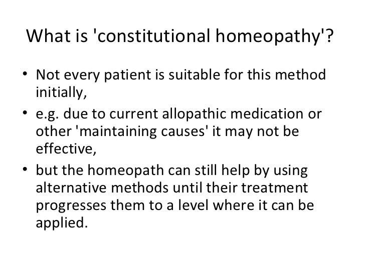 - 76. What is constitutional homeopathy?• Not every patient is suitable for this method initially,• e.g. due to current allopathic medication or other maintaining causes it may not be effective,• but the homeopath can still help by using alternative methods until their treatment progresses them to a level where it can be applied.