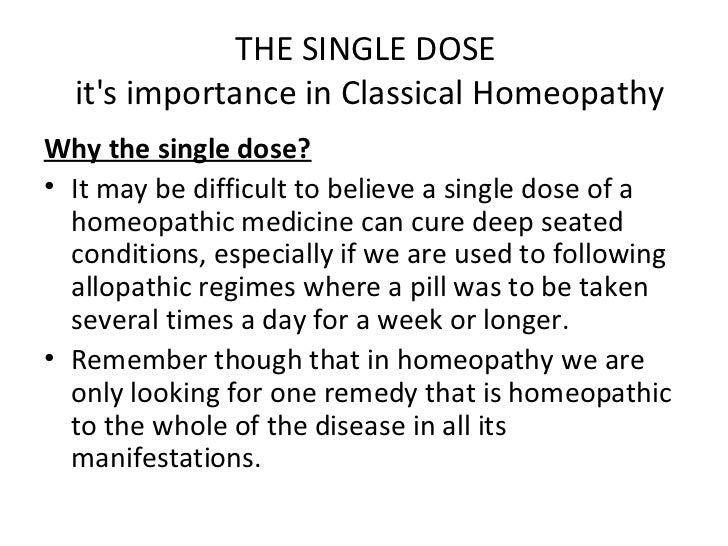 - 78. THE SINGLE DOSE its importance in Classical HomeopathyWhy the single dose?• It may be difficult to believe a single dose of a homeopathic medicine can cure deep seated conditions, especially if we are used to following allopathic regimes where a pill was to be taken several times a day for a week or longer.• Remember though that in homeopathy we are only looking for one remedy that is homeopathic to the whole of the disease in all its manifestations.