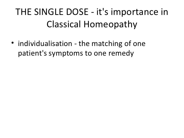 - 79. THE SINGLE DOSE - its importance in Classical Homeopathy• individualisation - the matching of one patients symptoms to one remedy
