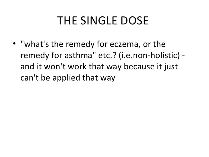 - 80. THE SINGLE DOSE• "whats the remedy for eczema, or the remedy for asthma" etc.? (i.e.non-holistic) - and it wont work that way because it just cant be applied that way