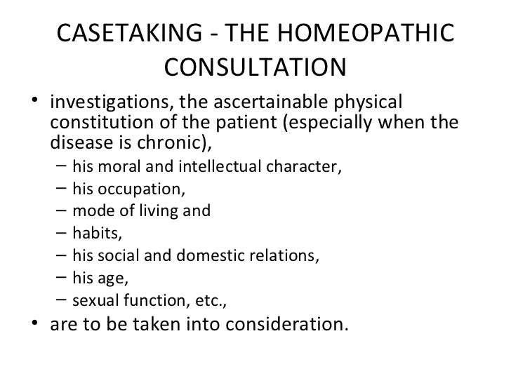 - 81. CASETAKING - THE HOMEOPATHIC CONSULTATION• investigations, the ascertainable physical constitution of the patient (especially when the disease is chronic), – his moral and intellectual character, – his occupation, – mode of living and – habits, – his social and domestic relations, – his age, – sexual function, etc.,• are to be taken into consideration.