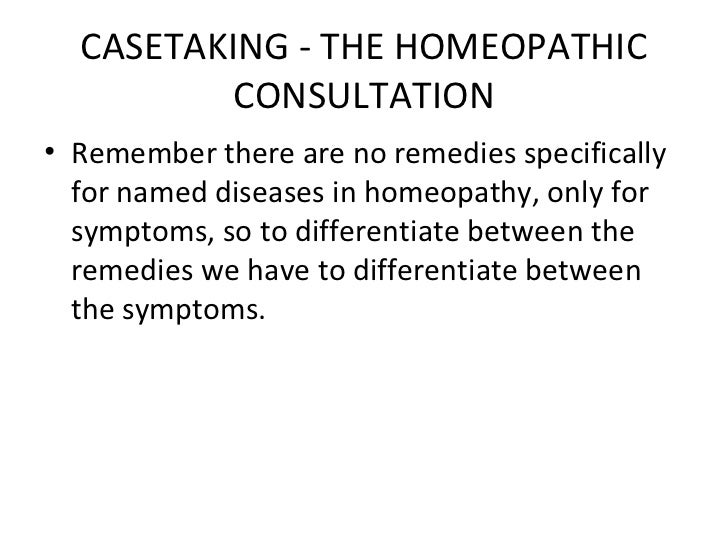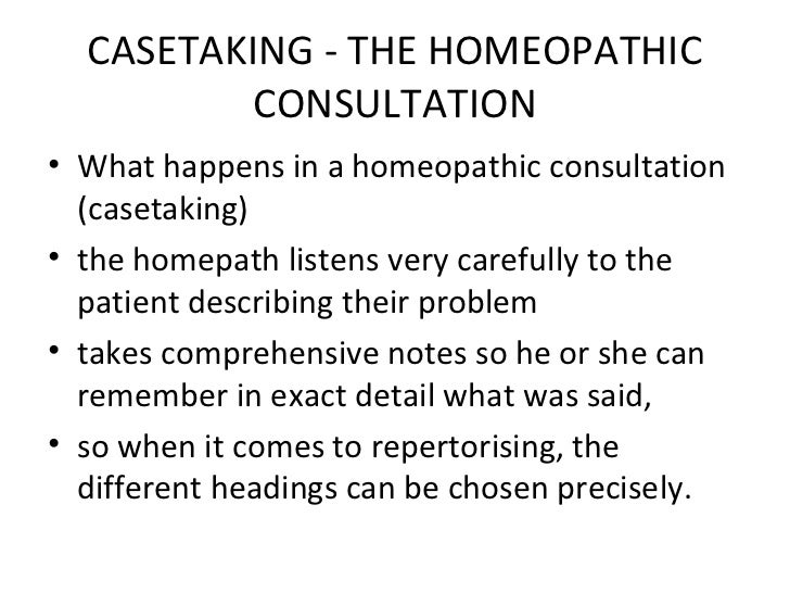 - 82. CASETAKING - THE HOMEOPATHIC CONSULTATION• What happens in a homeopathic consultation (casetaking)• the homepath listens very carefully to the patient describing their problem• takes comprehensive notes so he or she can remember in exact detail what was said,• so when it comes to repertorising, the different headings can be chosen precisely.