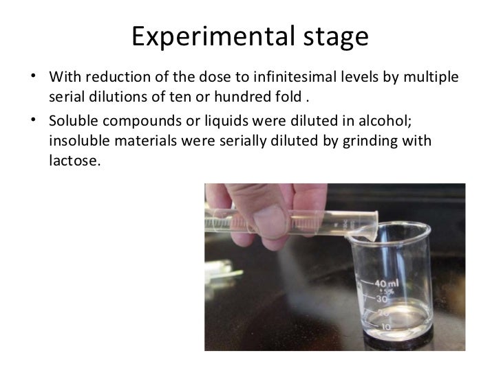 - 9. Experimental stage• With reduction of the dose to infinitesimal levels by multiple serial dilutions of ten or hundred fold .• Soluble compounds or liquids were diluted in alcohol; insoluble materials were serially diluted by grinding with lactose.