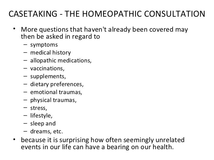 - 83. CASETAKING - THE HOMEOPATHIC CONSULTATION• More questions that havent already been covered may then be asked in regard to – symptoms – medical history – allopathic medications, – vaccinations, – supplements, – dietary preferences, – emotional traumas, – physical traumas, – stress, – lifestyle, – sleep and – dreams, etc.• because it is surprising how often seemingly unrelated events in our life can have a bearing on our health.