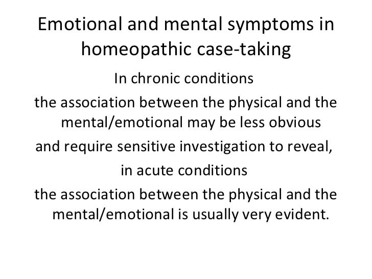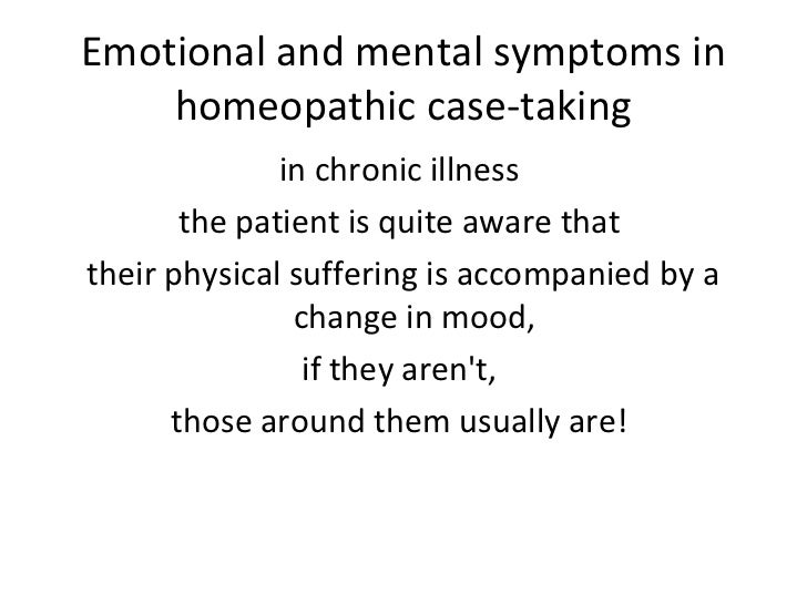 - 87. Emotional and mental symptoms in homeopathic case-taking in chronic illness the patient is quite aware thattheir physical suffering is accompanied by a change in mood, if they arent, those around them usually are!