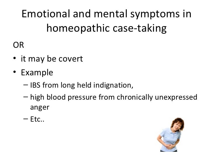 - 90. Emotional and mental symptoms in homeopathic case-takingOR• it may be covert• Example – IBS from long held indignation, – high blood pressure from chronically unexpressed anger – Etc..