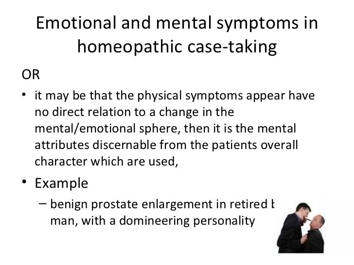 - 91. Emotional and mental symptoms in homeopathic case-takingOR• it may be that the physical symptoms appear have no direct relation to a change in the mental/emotional sphere, then it is the mental attributes discernable from the patients overall character which are used,• Example – benign prostate enlargement in retired business man, with a domineering personality