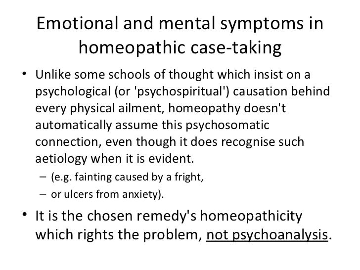 - 92. Emotional and mental symptoms in homeopathic case-taking• Unlike some schools of thought which insist on a psychological (or psychospiritual) causation behind every physical ailment, homeopathy doesnt automatically assume this psychosomatic connection, even though it does recognise such aetiology when it is evident. – (e.g. fainting caused by a fright, – or ulcers from anxiety).• It is the chosen remedys homeopathicity which rights the problem, not psychoanalysis.